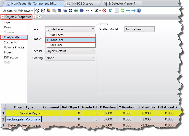 我們要在矩形體的前表面使用該膜層。首先打開物體2的物體屬性 (Object Properties),選擇膜層/散射 (Coating/Scattering) 選項卡。該選項卡下的第一項輸入欄為物體的表面 (Face)。對于矩形體物體來說一共包含三個表面組:0,表示側(cè)面;1,表示前面;2,表示后面。