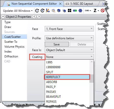 默認情況下,物體的任何表面都沒有定義膜層。對于矩形體的前面,通過下方的膜層 (Coating) 下拉菜單選擇新創(chuàng)建的理想膜層60REFLECT: