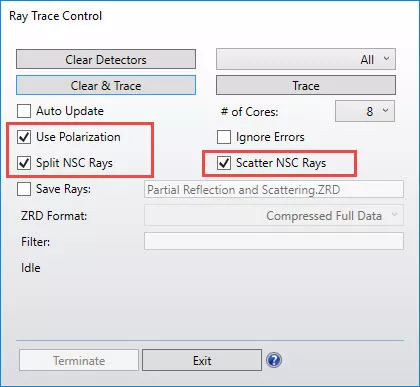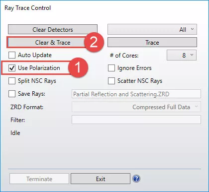 在選擇了合適的膜層之后,點擊OK將膜層添加到物體表面上并退出物體屬性菜單。為了證實膜層已經(jīng)被使用并正確工作,我們可以運行光線追跡(勾選使用偏振 (Use Polarization) 選項)來進行驗證。