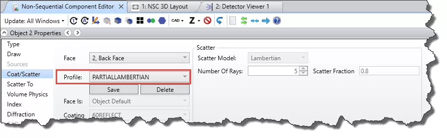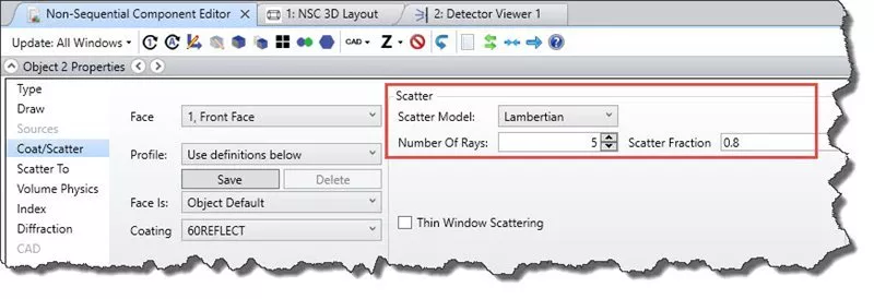 可以看到我們已經(jīng)在OpticStudio中完成了部分反射和散射表面的創(chuàng)建。在本例中使用的工具和概念可以應用到更復雜的系統(tǒng)之中,其中使用到的定義膜層和散射屬性的基本方法都是相同的。