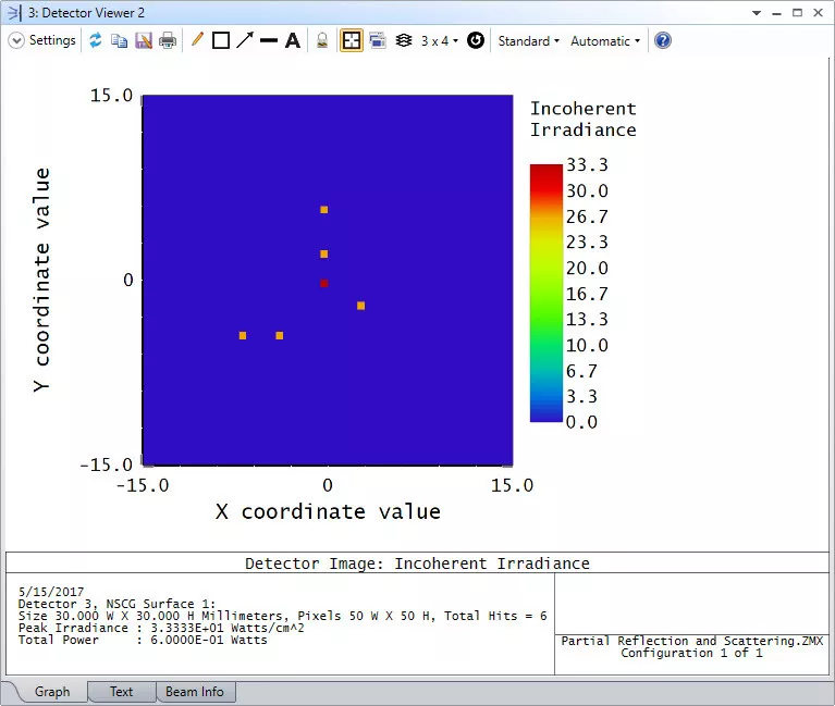 并且,如果我們執(zhí)行另一次蒙特卡羅光線追跡,這些光線(5根散射光線都落在探測器上時)的總能量將始終為0.6W,也就是入射光能量的60%。