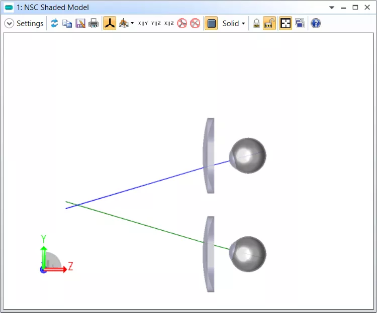 非序列人眼模型包含在Eye_NSC.zmx文件中,它使用了與序列模式眼睛模型相同的玻璃庫(kù)。非序列元件編輯器里的第一個(gè)物體是位于眼球幾何中心的參考點(diǎn)。你可以修改它的參數(shù)來(lái)實(shí)現(xiàn)整個(gè)眼球模型的移動(dòng)和旋轉(zhuǎn)。非序列實(shí)體模型 (NSC Shaded Model) 圖的設(shè)置 (Settings) 賦予了模型90%的亮度和50%的透明度,方便我們觀察眼球的內(nèi)部結(jié)構(gòu)。