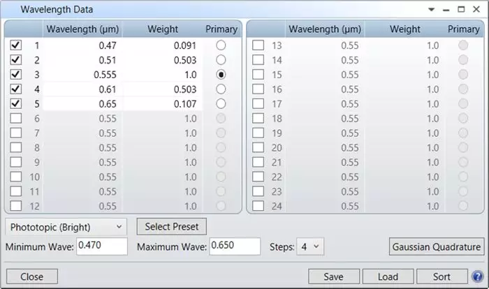 2. 波長(zhǎng):對(duì)于眼睛模型來(lái)說(shuō),OpticStudio插入F,d,C可見(jiàn)光光譜波長(zhǎng)或插入帶有相對(duì)照度權(quán)重的明視(或暗視)波長(zhǎng)的功能非常有用。F,d,C波長(zhǎng)通常適用于觀察視網(wǎng)膜(如Eye_Retinal Object模型),而明視波長(zhǎng)通常適用于通過(guò)人眼觀察的光學(xué)系統(tǒng)(如 Eye_Retinal Image 模型)。打開(kāi)系統(tǒng)選項(xiàng) (System Explorer)…波長(zhǎng) (Wavelengths)…明視覺(jué) (Photopic (Bright)),點(diǎn)擊選為當(dāng)前 (Select Preset)。