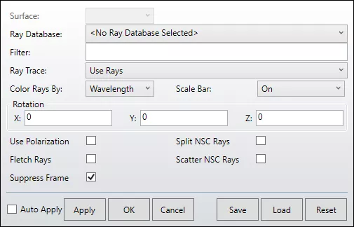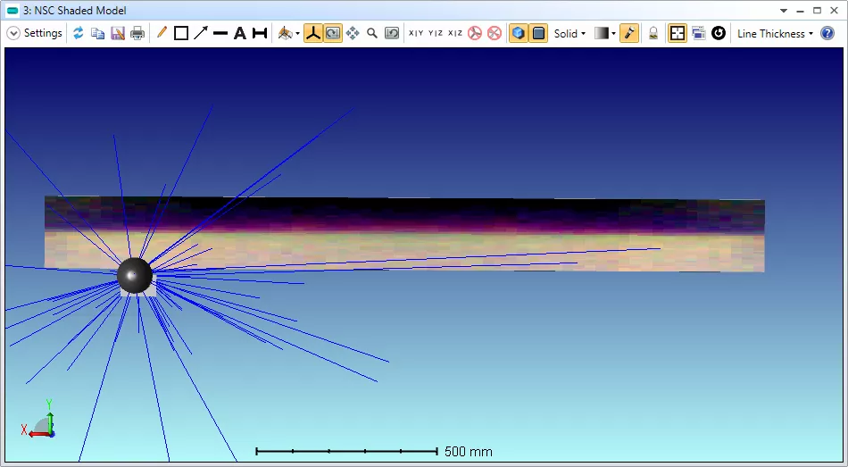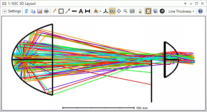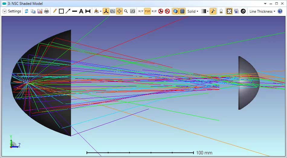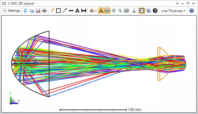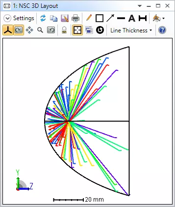 現(xiàn)在回到三維布局圖 (3D Layout)的設置,設定顏色顯示 (Color Rays): 波長 (Wavelength),可以看到如下結果: