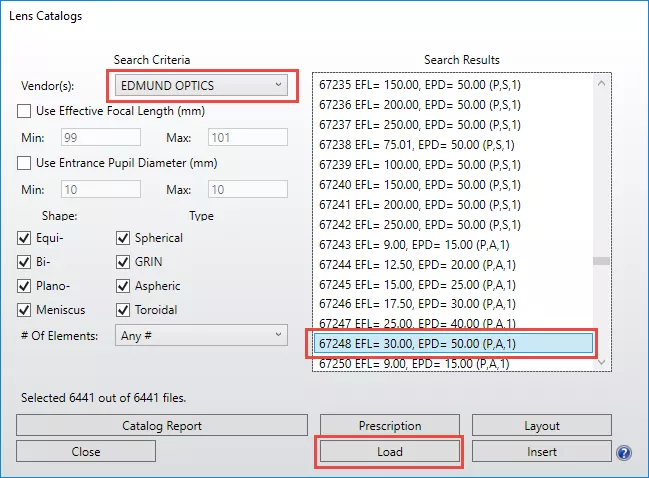 利用OpticStudio中內建的透鏡資料庫 (Lens Catalog) 可以快速搜尋并套入各大透鏡提供廠商。