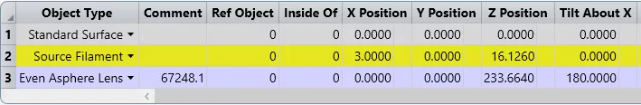 我們將建立帶有黑體輻射頻譜的鎢絲光源,首先是光源的外型,新增物件定設定如下: 物體2 (Object 2): 燈絲光源 (Source Filament)