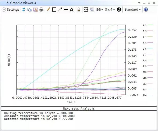 圖中所示為無(wú)DC偏移,焦平面陣列(FPA)其對(duì)角線上每一表面NITD的貢獻(xiàn),圖中右側(cè)為各個(gè)表面的標(biāo)注。
