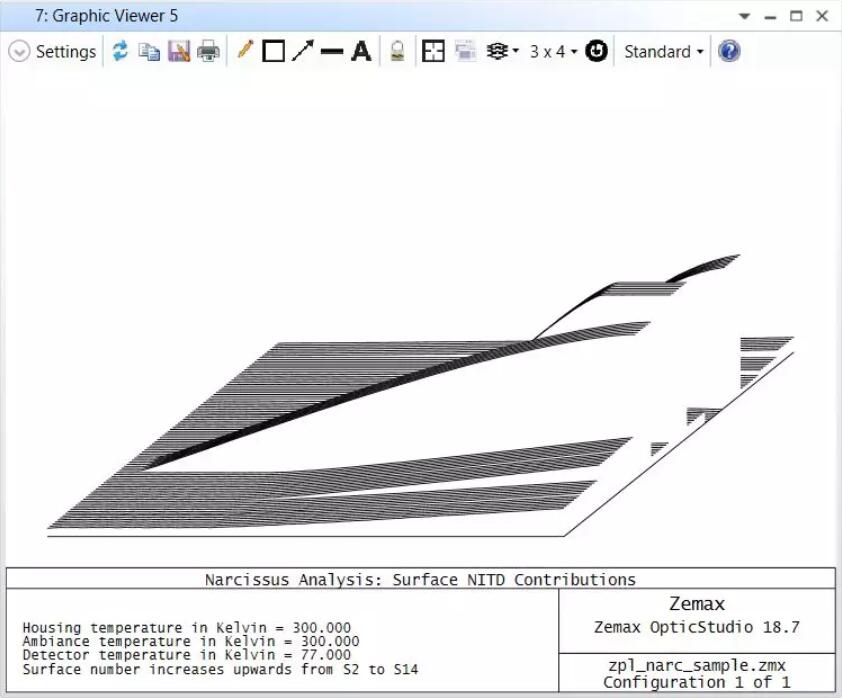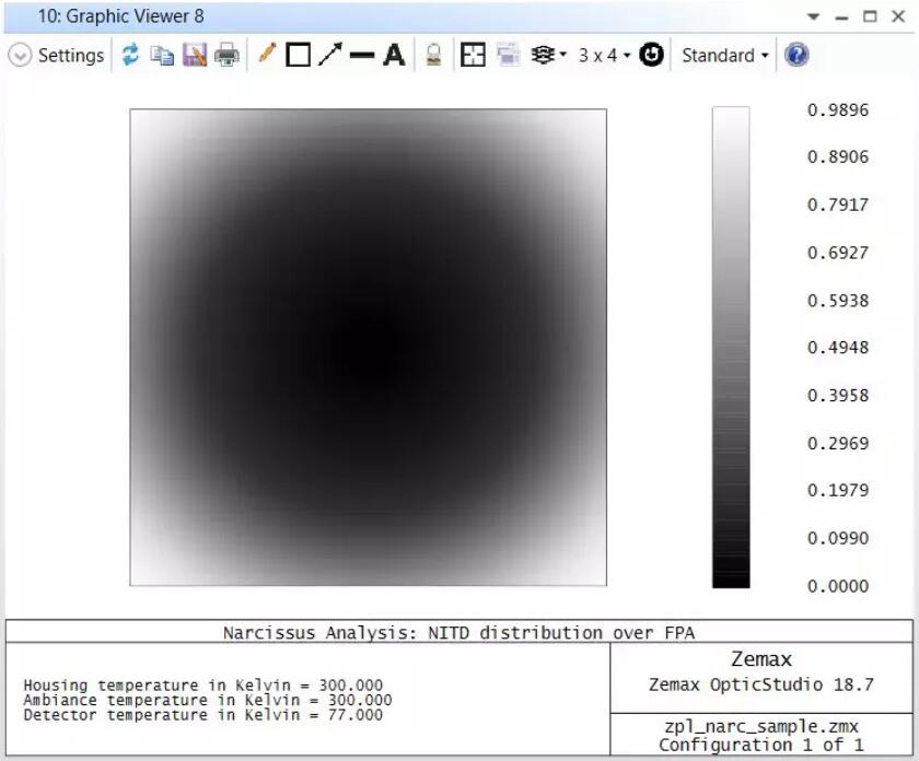 宏文件Narcissus.ZPL需要的條件有:探測(cè)器溫度、機(jī)械結(jié)構(gòu)溫度、環(huán)境溫度和OpticStudio鬼像生成器生成的單次反射鬼像文件。鬼像文件必須保存在設(shè)計(jì)文件所在文件夾中。使用者還需在漸暈圖分析窗口的設(shè)置中通過(guò)單擊保存按鈕來(lái)保存設(shè)置。