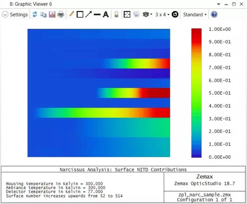 圖中所示為使用PLOT2D,以偽彩圖為DISPLAYTYPE繪制的含DC偏移,沿FPA對(duì)角線表面NITD的貢獻(xiàn)。水平方向是FPA對(duì)角線方向,垂直方向是表面數(shù)。表面數(shù)沿軸向上增加。比例尺上的數(shù)值不是計(jì)算值而是默認(rèn)值。