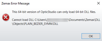 過(guò)去,OpticStudio曾發(fā)布過(guò)32位和64位程序,這意味著根據(jù)不同的OpticStudio,32位和64位的DLL都可能存在?,F(xiàn)在,OpticStudio只支持64位的應(yīng)用。如果在使用DLL時(shí)彈出以下錯(cuò)誤信息,那么源代碼必須使用本文的步驟重新編譯。
