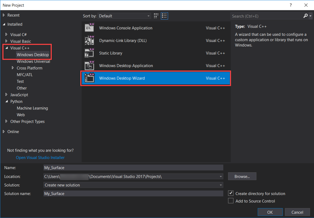在Visual C++選項(xiàng)下,選擇Windows Desktop Wizard項(xiàng)目類(lèi)型。