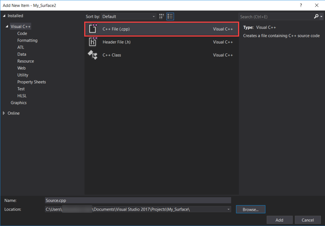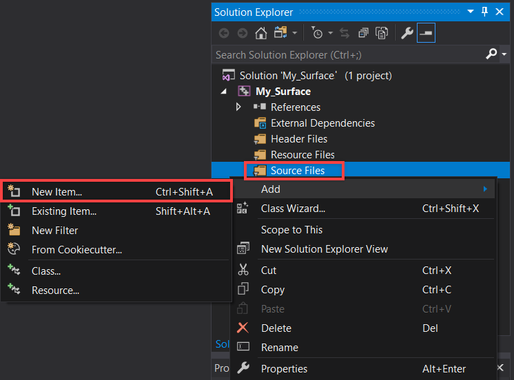 接下來(lái),添加Source File。Source File必須是CPP類(lèi)型,所以選擇“New Item…”并選擇C++ File。