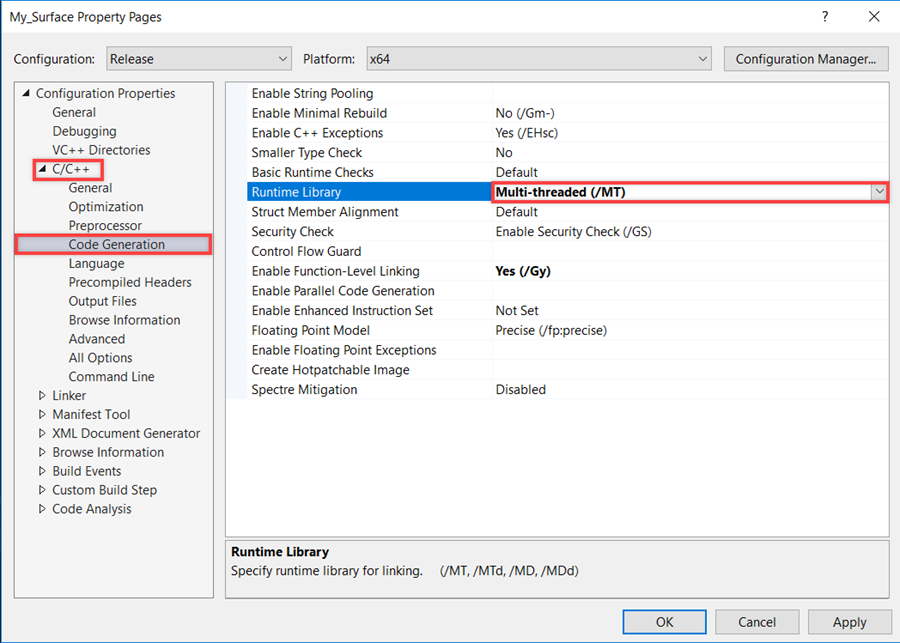 然后,在Configuration Properties…C/C++…Code Generation選取“Runtime Library”。一般地,我們推薦使用Multi-threaded (/MT)或者M(jìn)ulti-threaded DLL (/MD)。