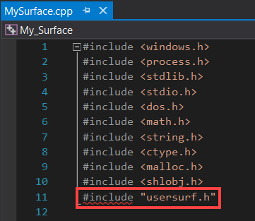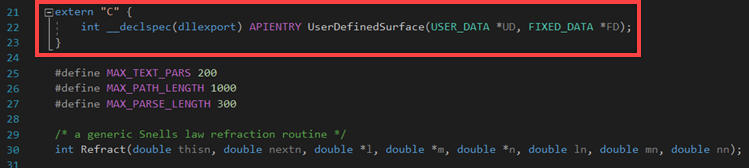 現(xiàn)在,我們來(lái)檢查并確保所有內(nèi)容都能被母代碼識(shí)別。如果該DLL是個(gè)用戶(hù)自定義表面且source file路徑不在{Zemax}\DLL\Surfaces文件夾,那么頭文件“usersurf.h”會(huì)不被認(rèn)可(由紅色下劃線表征)。
