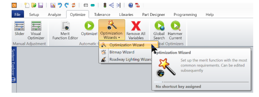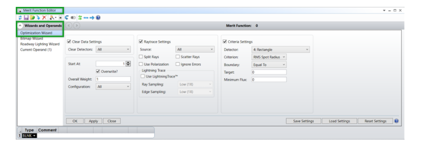 您還可以通過單擊評價函數(shù)編輯器中的 優(yōu)化向導和操作數(shù) (Wizards and Operands) 來訪問優(yōu)化向導(注意此工具在混合模式下不可用)。下面的窗口中評價功能組件簡潔地被劃分為三類。