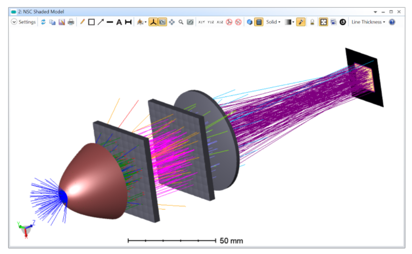 為了演示該功能的工作方式,請打開以下文件:“{Zemax}\Samples\Non-sequential\Miscellaneous\Digital_projector_flys_eye_homogenizer.zmx.”。顧名思義,該系統(tǒng)被設計用于數(shù)字投影儀,其中透鏡陣列通過模擬多個光源而不是一個非均勻光源來均勻化光束。