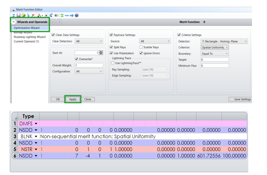 對于任何投影系統(tǒng)來說,最重要的兩個性能是光通量均勻性和效率。我們可以構建一個以這兩種性能為目標的評價函數(shù)。打開評價函數(shù)編輯器并打開優(yōu)化向導。如前文所述操作,“清除數(shù)據(jù)設置”和“清除探測器:”設置應該保持原樣。在光線追跡設置下,勾選啟用 分裂光線 (Split Rays), 使用偏振 (Use Polarization),和 忽略錯誤 (Ignore Errors)。我們的目標是最終的像平面,所以從目標設置中選擇探測器對象7。我們將“空間均勻度 (Spatial Uniformity)”定義為評價標準,邊界條件為“等于”零。注意,這實際上是針對光通量分布的標準差設置,因此零這個值代表完全均勻。保留所有其他設置的默認值并點擊 應用 (Apply)。創(chuàng)建的對話框和設置的評價函數(shù)如下圖所示: