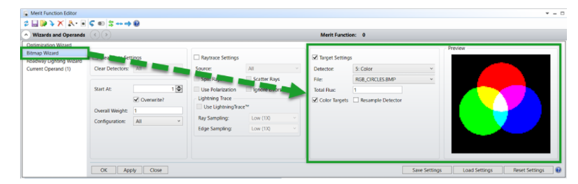 非序列 BMP 位圖向導是一個專門用于定位探測器上復雜的光通量和顏色分布的工具。窗口中的大多數(shù)設置,如下圖所示,與前面討論的評價功能工具相同,而這里的區(qū)別在于“目標設置 (Target Settings)”部分。