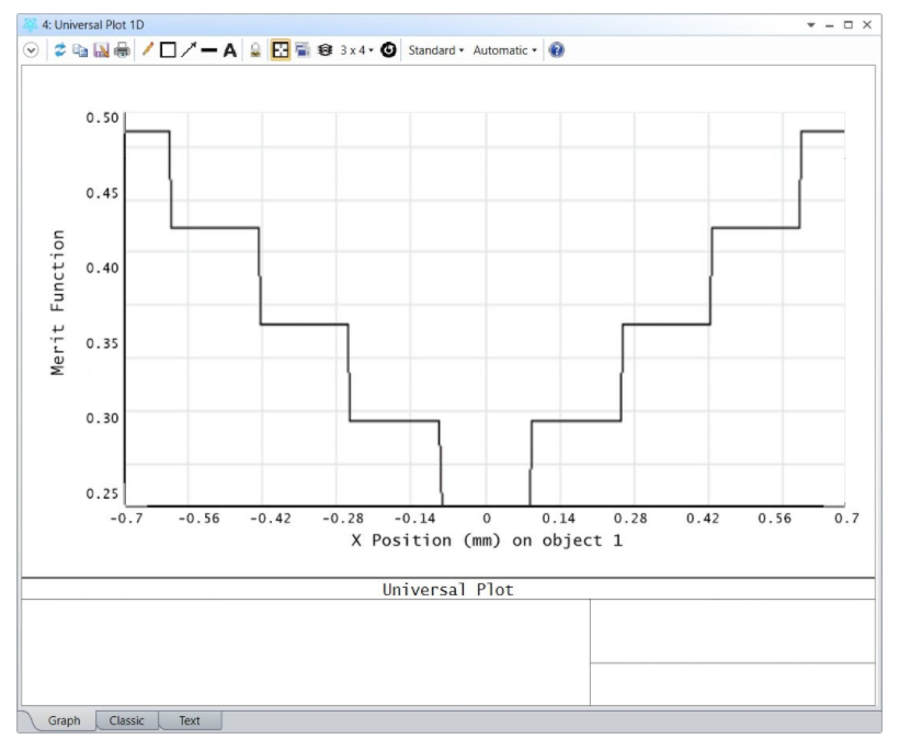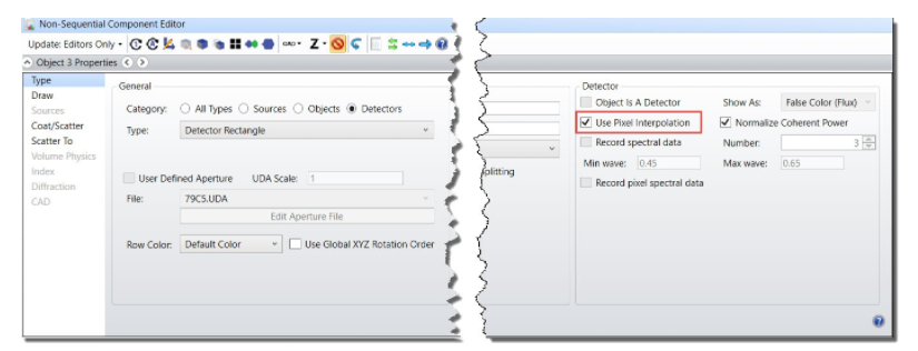 避免由像素探測(cè)器引起的量化效應(yīng)的一種方法是使用像素插值。不是將100%的光線能量分配給單個(gè)被擊中的像素,而是根據(jù)光線在像素內(nèi)的截距位置將一部分能量分配給相鄰像素。因此,當(dāng)系統(tǒng)變化導(dǎo)致光線在像素上移動(dòng)時(shí),評(píng)價(jià)函數(shù)會(huì)發(fā)生明顯的變化??梢栽谔綔y(cè)器的 物體屬性( Object Properties )> 類型(Type )中啟用像素插值。