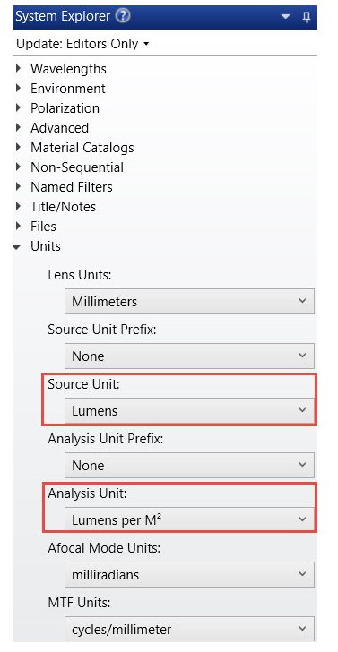 LED 的光通量是以流明為單位來(lái)測(cè)量的,所以我們選擇該單位進(jìn)行模擬。因此光照度單位為lm/m 2或 Lux。發(fā)光強(qiáng)度(“亮度”)是用 lm/sr(流明/立體角)或 Cd(坎德拉)來(lái)計(jì)量的。亮度用 lm/m 2/sr或Cd/m 2 來(lái)計(jì)量,有時(shí)也稱為 nit(尼特)。系統(tǒng)初始設(shè)置如下: