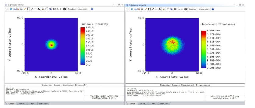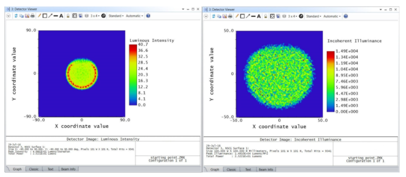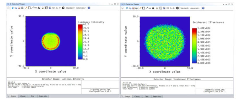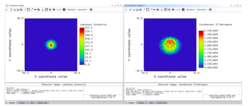 LED 光源將光線射向一面平面鏡,然后照亮探測(cè)器表面。這個(gè)文件可以從本文頂部的示例文件鏈接處下載??梢钥吹教綔y(cè)器上的空間分布和角度分布如下圖: