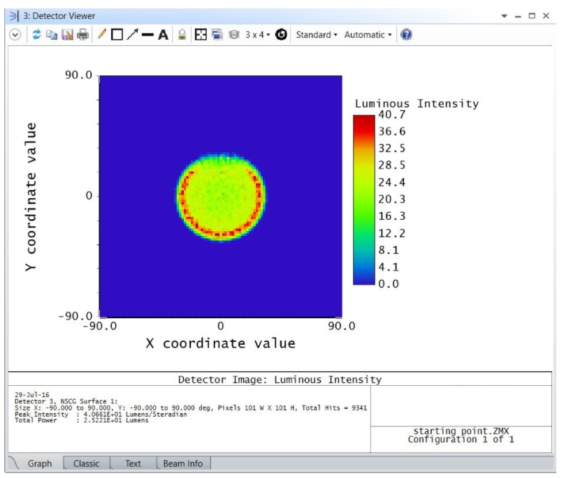 從發(fā)光強(qiáng)度圖中可以看出,41 Cd左右的峰值亮度發(fā)生在極角為27°左右時(shí)。近似垂直于探測(cè)器表面的光線只有23 Cd 的發(fā)光強(qiáng)度(將在下面討論如何得到這個(gè)數(shù)字)。這樣的輪廓對(duì)于車(chē)前燈照明系統(tǒng)或投影機(jī)照明系統(tǒng)來(lái)說(shuō)并不好。一般情況下,我們希望低角度時(shí)的光亮度盡可能高,這樣光源就可以投射到遠(yuǎn)處。
