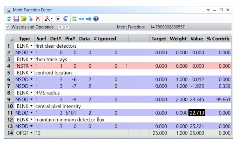 最后一個(gè) NSDD 操作數(shù)與一個(gè) OPGT 操作數(shù)相結(jié)合,以保持探測(cè)器上的最小光通量。我們把這個(gè)設(shè)為25,因?yàn)檫@是探測(cè)器上的初始光通量。如果這個(gè)操作數(shù)不存在,那么完全移除反射鏡就有可能使評(píng)價(jià)函數(shù)值為0!如果沒(méi)有能量落在探測(cè)器上,質(zhì)心強(qiáng)度和 RMS 半徑為零,這就是我們的目標(biāo)。這個(gè)“解”強(qiáng)調(diào)了定義良好的評(píng)價(jià)函數(shù)的重要性。在優(yōu)化過(guò)程中,OpticStudio 將嘗試將評(píng)價(jià)函數(shù)變?yōu)榱?,而不管這在系統(tǒng)中的物理意義。
