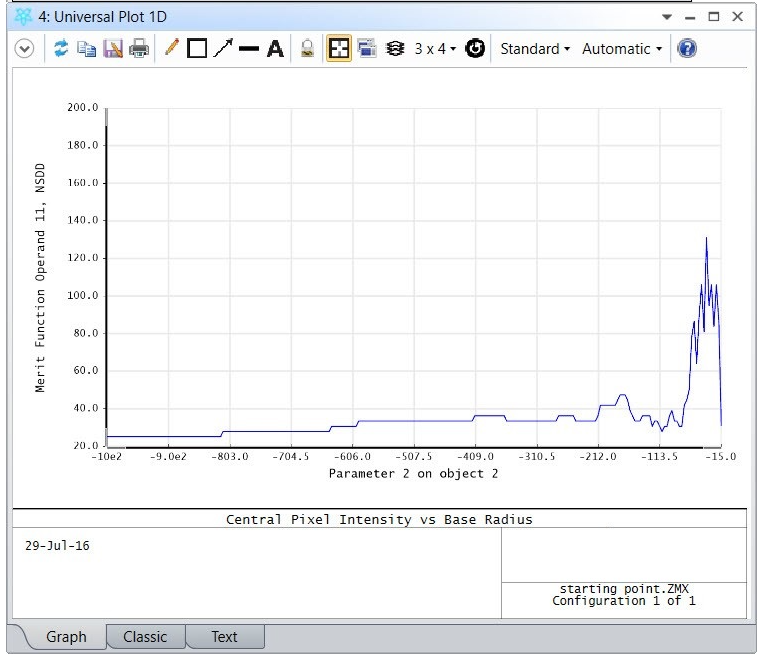 現(xiàn)在,如果我們使用全局繪圖,可以在掃描反射鏡曲率半徑時(shí)顯示中心像素強(qiáng)度。