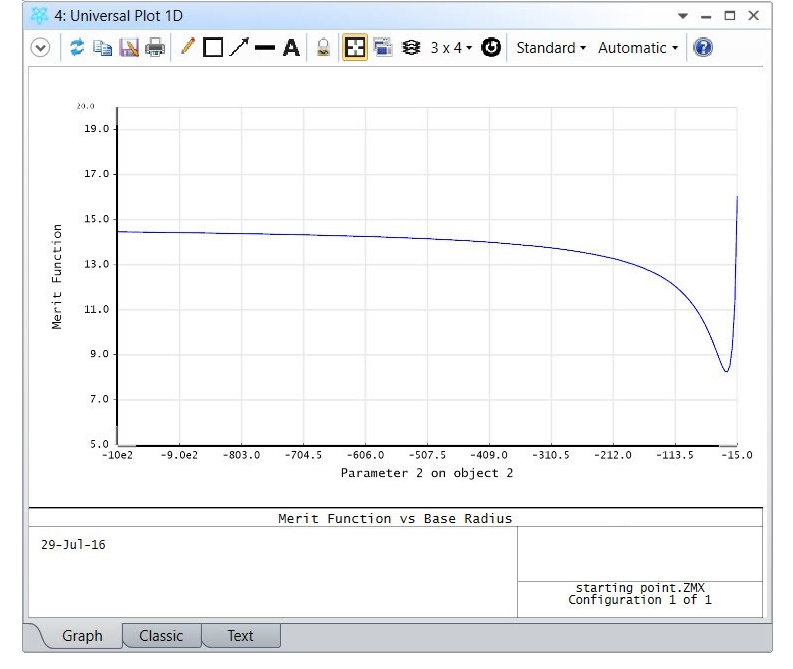 這張圖說(shuō)明了優(yōu)化非序列系統(tǒng)的困難,以及定義良好的評(píng)價(jià)函數(shù)的必要性。如果我們看一下整體的評(píng)價(jià)函數(shù)值與曲率半徑的關(guān)系,就能明白為什么質(zhì)心和均方根半徑是更好的優(yōu)化目標(biāo)。