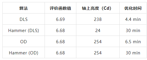 為了測(cè)試我們得到的是一個(gè)可信的最優(yōu)解,而不是陷入一個(gè)較高的局部最小值,我們將運(yùn)行錘形優(yōu)化器來(lái)優(yōu)化這兩個(gè)系統(tǒng)。下表整理的結(jié)果表明,DLS 優(yōu)化得到了一定的改善,但中心像素亮度仍低于 OD 算法優(yōu)化得到的像素亮度;進(jìn)一步說(shuō)明了這兩個(gè)局部?jī)?yōu)化例程的強(qiáng)大功能。在這些測(cè)試中使用的機(jī)器擁有英特爾四核CPU (2.90 GHz)和 16GB 運(yùn)行內(nèi)存: