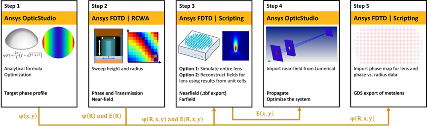 一旦從第2步構(gòu)建了相位/光場相對于半徑的庫,就有兩種方法可用于設(shè)計(jì)和分析超透鏡整體: