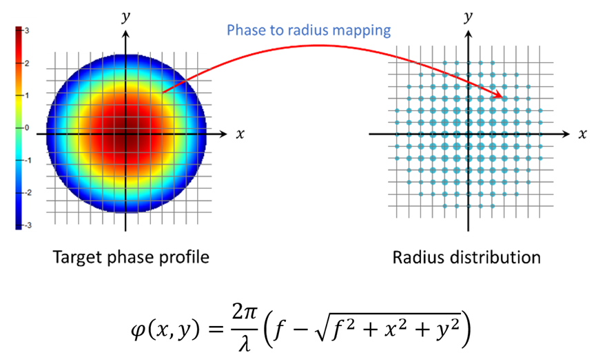 無論目標(biāo)相位分布可能是什么,完整透鏡設(shè)計(jì)都涉及將空間相位分布轉(zhuǎn)換為空間(納米棒)半徑分布。下面顯示了一個球形相位分布的示例,但該原理適用于任意相位分布。