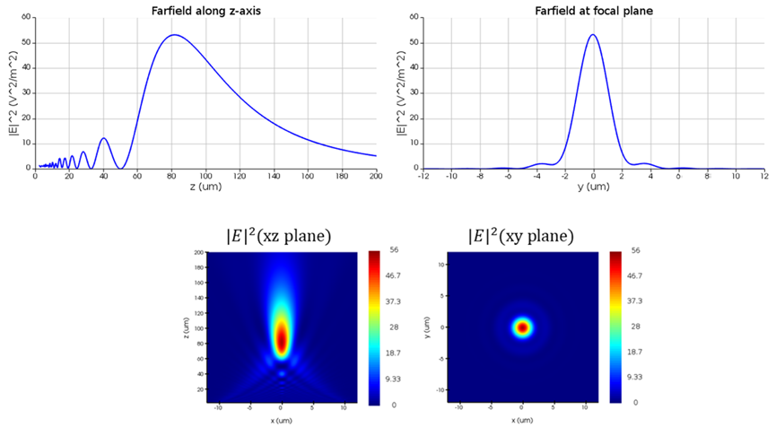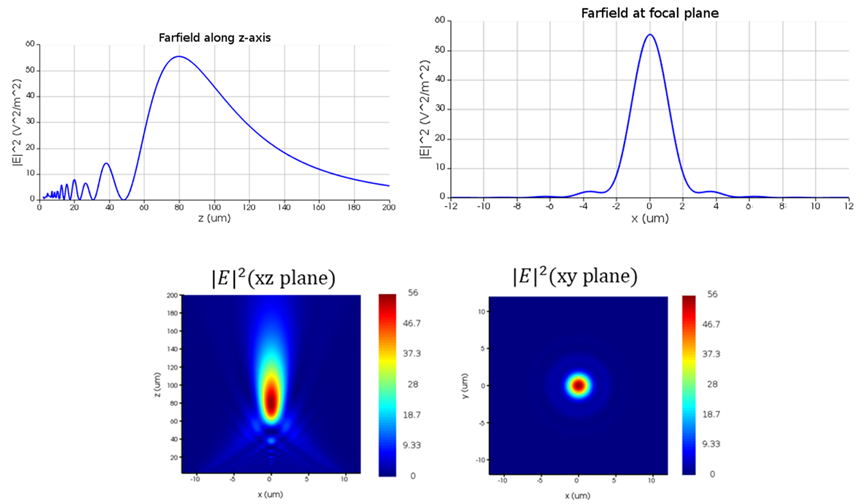 沿傳播軸(Z)的遠(yuǎn)場投影表明,超透鏡的焦距約為81.4 um,焦平面處光束的FWHM(半高全寬)約為2.4 um。計(jì)算出的焦距與100 um的目標(biāo)值有些偏離。這主要?dú)w因于透鏡尺寸小,因此用于映射透鏡半徑上的2*pi變化的納米棒數(shù)量較少。增加鏡頭尺寸可能有助于改善結(jié)果以及優(yōu)化其他參數(shù),例如周期。