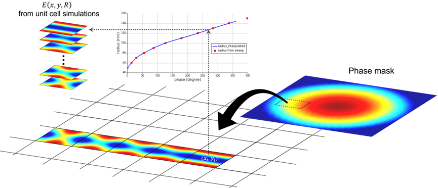 使用步驟1中的目標(biāo)相位分布和步驟2中的半徑/光場vs.相位數(shù)據(jù)庫,我們現(xiàn)在準(zhǔn)備好設(shè)計(jì)完整的超透鏡。