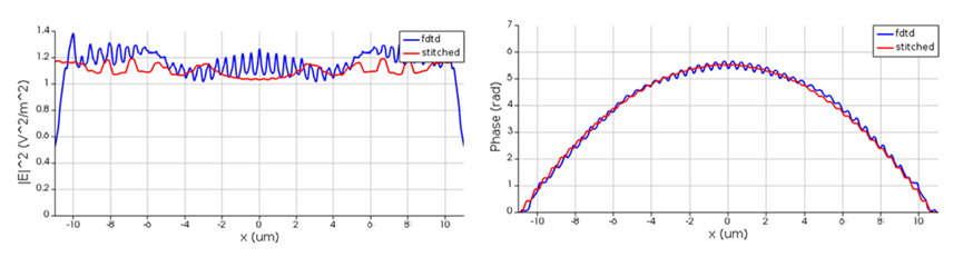 拼接近場的振幅看起來與直接FDTD模擬的振幅大不相同。這可以歸因于兩種方法中使用的設(shè)置略有不同: