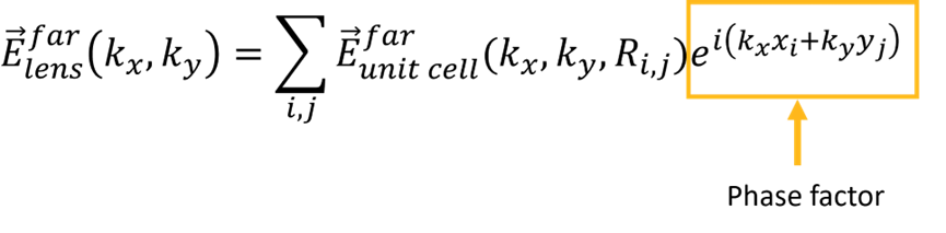 這相當(dāng)于近場拼接方法,但順序相反。在這里,我們首先從步驟2中構(gòu)建的近場數(shù)據(jù)庫來構(gòu)建遠(yuǎn)場庫。然后,我們通過考慮其從原點(diǎn)的位置偏移產(chǎn)生的相移來總結(jié)每個納米棒的遠(yuǎn)場結(jié)果的貢獻(xiàn)。該方法可以用數(shù)學(xué)形式描述如下: